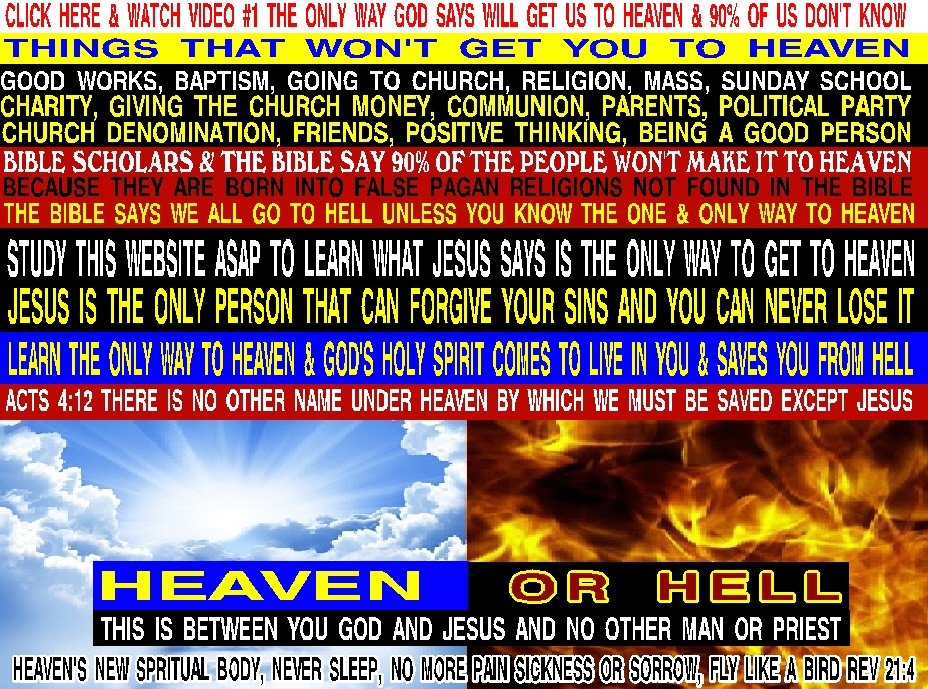 REMEMBER WHEN IT GETS HOTTER THAN HELL IN THE SUMMER, HOW MUCH YOU LOVE THAT AIR CONDITIONING? WELL YOU BETTER LEARN THE ONE & ONLY WAY TO GET TO HEAVEN ACCORDING TO GOD IN THE CHRISTIAN BIBLE BECAUSE THERE ISN'T ANY COOL WATER OR AC IN HELL. WHEN YOU DIE, YOU'RE STUCK IN HELL FOREVER IF YOU DIDN'T LEARN AND BELIEVE THE ONLY WAY TO HEAVEN FROM GOD IN THE BIBLE THAT ONLY 10% OF US KNOW. STUDY THIS WEBSITE AND WATCH VIDEO #1 ASAP TO GET TO HEAVEN GUARANTEED FROM A FORMER CATHOLIC & TELL EVERYONE YOU WOULD LIKE TO SEE IN HEAVEN TO WATCH IT. I WISH I WAS RICH SO I COULD GIVE AWAY MONEY TO MAKE PEOPLE HAPPY, BUT I HAVE SOMETHING MUCH GREATER THAN TONS OF MONEY THAT YOU CAN'T TAKE WITH YOU WHEN YOU DIE. IF YOU STUDY MY WEBSITE, YOU CAN FIND OUT HOW EASY IT IS TO GET TO HEAVEN FOREVER WHEN YOU KNOW THE TRUTH. THE BIBLE SAYS 90% OF THE PEOPLE WON'T MAKE IT TO HEAVEN FOR LACK OF THE CORRECT BIBLICAL KNOWLEDGE INCLUDING ALL THE PEOPLE THAT GO TO CHURCH. STUDY MY WEBSITE, & BE IN THE 10% THAT KNOW THE TRUTH OF HOW TO GET TO HEAVEN AND PASS IT ON. AFTER TENS OF THOUSANDS OF HOURS OF RESEARCH & PROGRAMMING, I HAVE PUT TOGETHER A FABULOUS WEBSITE THAT TELLS THE ONE & ONLY WAY TO GET TO HEAVEN ACCORDING TO GOD IN THE BIBLE. BILLIONS OF GOD LOVING PEOPLE HAVE GONE TO CHURCH ALL THEIR LIVES AND DON'T REALIZE THEY ARE NOT ON THEIR WAY TO HEAVEN, BECAUSE THEY WERE BORN INTO FALSE MAN MADE RELIGIONS & BELIEVE FALSE INFORMATION & THEY DON'T KNOW THERE IS ONLY ONE WAY TO GET THERE. I WAS ONE OF THEM. ................................................................................................................................................................... IT DOESN'T MATTER HOW MUCH YOU LOVE YOUR CHURCH OR FALSE RELIGION, IF IT WON'T GET YOU TO HEAVEN, IT WON'T MATTER & YOU WILL BE IN EXTREME TORMENT IN HELL FOREVER. ................................................................................................................................................................... YOU HAVE TO KNOW THE ONLY WAY TO HEAVEN ACCORDING TO GOD IN SHORT VIDEO #1 YOU MUST SEE ASAP ON MY WEBSITE. COULD YOU PLEASE MAKE A DONATION OF ANY AMOUNT AT THE BOTTOM OF THIS PAGE TO SAY THANKS FOR YOU BEING ABLE TO GET TO HEAVEN GUARANTEED BY LEARNING THE ONE & ONLY WAY TO HEAVEN ON MY WEBSITE & TELL EVERYONE TO STUDY AND SHARE IT. ATTENTION: ALL PEOPLE THAT DON'T WANT TO SUFFER IN THE LAKE OF FIRE IN HELL FOREVER. YOU MUST STUDY THIS WEBSITE ASAP TO LEARN GODS ONLY WAY TO HEAVEN THAT ONLY 10% OF THE POPULATION KNOWS. 90% OF ALL PEOPLE ARE BORN INTO OVER 4000 FALSE MAN MADE PAGAN RELIGIONS THAT CAN'T GET ONE PERSON TO HEAVEN. DEFINITION OF PAGAN: WORSHIPER OF FALSE GODS! THEY DO NOT KNOW THE PRICELESS INFORMATION ON THIS WEBSITE FROM GOD TELLING YOU THE ONE & ONLY WAY TO HEAVEN. ALSO 90% OF THE PEOPLE WILL TAKE THE DEVILS MARK OF THE BEAST FROM ALL GOVERNMENTS TO BUY & SELL ANYTHING INCLUDING FOOD OR YOU WILL BE KILLED. IF YOU TAKE THE MARK, YOU CAN NEVER GO TO HEAVEN. THIS IS WHY YOU MUST STUDY THIS WEBSITE AND TELL EVERYONE TO STUDY IT ASAP. IF YOU DIE BEFORE YOU LEARN THE ONLY WAY GOD SAYS IN THE BIBLE THAT WILL GET YOU TO HEAVEN, IT'S TOO LATE TO AVOID HELL. YOU HAVE TO CHOOSE HEAVEN BEFORE YOU DIE. NO RELIGION CAN GET YOU TO HEAVEN. ONLY CHRISTIANITY, BELIEVING THE CORRECT CHRISTIAN BIBLE VERSES. MOST PEOPLE NEVER READ THE BIBLE SO HOW ARE THEY GOING TO KNOW THE TRUTH. EVEN IF THEY READ THE BIBLE THEY STILL MIGHT NOT KNOW EXACTLY WHAT GOD SAYS YOU HAVE TO KNOW & BELIEVE TO GET TO HEAVEN. THAT'S WHY THIS WEBSITE IS SO VALUABLE. GOING TO CHURCH WON'T GET YOU TO HEAVEN. GIVING THE CHURCH MILLIONS OF $$ WON'T GET ANYONE TO HEAVEN. ONLY WATCHING VIDEO #1 AND STUDYING ALL THE BIBLE VERSES AND SHORT VIDEOS ON OUR WEBSITE WILL GET YOU TO HEAVEN GUARANTEED! YOU MUST SEE THIS PRICELESS INFORMATION ASAP BECAUSE ANY DAY NOW IT COULD BE TOO LATE. THEN YOU CAN SHARE THIS WITH ALL YOUR FAMILY & FRIENDS THAT YOU WOULD LIKE TO SEE IN HEAVEN. BILLIONS OF GOD LOVING PEOPLE HAVE GONE TO CHURCH ALL THEIR LIFE, BUT DON'T REALIZE THEY ARE NOT ON THEIR WAY TO HEAVEN. I WAS ONE OF THEM. STUDY THIS WEBSITE TO BE IN THE ONLY 10% THAT KNOW THE ONE AND ONLY WAY TO HEAVEN. THIS IS WHY WE MUST BE SURE WE KNOW THE CORRECT WAY TO GET TO HEAVEN, ACCORDING TO GOD IN THE BIBLE, TO BE WITH OUR LOVED ONES AND FRIENDS FOREVER IN OUR NEW YOUNG SUPERNATURAL SPIRITUAL BODIES THAT CAN FLY LIKE A BIRD, THAT WILL LIVE FOREVER. IF YOU KNOW GOD'S TRUTH OF HOW TO GET TO HEAVEN, YOU WON'T EVEN HAVE TO DIE IF THE END OF THE WORLD & WW3 COMES WHILE YOU'RE STILL ALIVE. THE BIBLE SAYS MOST PEOPLE ARE ON THE WIDE ROAD THAT DOESN'T LEAD TO HEAVEN AND VERY FEW ARE ON THE NARROW ROAD THAT LEADS TO HEAVEN INCLUDING CHURCH GOERS BECAUSE MOST PEOPLE ARE BORN INTO FALSE MAN MADE RELIGIONS AND DON'T KNOW WHAT THE BIBLE SAYS YOU MUST KNOW AND BELIEVE TO GET TO HEAVEN. YOU MUST BELIEVE MANY BIBLE VERSES AND WATCH MANY SHORT SERMONS FROM AWESOME BIBLE SCHOLARS TO GET TO HEAVEN GUARANTEED. ![]() ![]() ARTICLE 2 THE BIBLE SAYS ONLY ABOUT 10% OF US WILL MAKE IT TO HEAVEN ON THE NARROW ROAD IN THE PICTURE ABOVE. EVERYONE ELSE WILL BE ON THE WIDE ROAD THAT LEADS TO HELL & THE LAKE OF FIRE FOR ETERNITY FOR LACK OF THE CORRECT BIBLICAL KNOWLEDGE. STUDY THIS WEBSITE AND TELL EVERYONE TO STUDY IT THAT WANTS TO GET TO HEAVEN. WATCH VIDEO #1 ASAP TO LEARN THE ONLY WAY TO HEAVEN ACCORDING TO GOD IN THE BIBLE THAT WILL GET YOU TO HEAVEN GUARANTEED. W W 3 & THE END OF THE WORLD WITH THE DEVIL'S MARK OF THE BEAST & THE ANTI-CHRIST ARE COMING VERY SOON. LEARN HOW TO MISS BOTH AND NEVER EVEN HAVE TO DIE. WATCH THIS SHORT VIDEO #1 FROM A FORMER CATHOLIC, NOW BIBLE SCHOLAR, THAT TELLS YOU WHAT GOD SAYS IN THE BIBLE IS THE ONE AND ONLY WAY TO GET TO HEAVEN THAT 90% OF US DON'T KNOW. THAT'S WHY 90% OF US WON'T MAKE IT TO HEAVEN, UNLESS YOU WATCH THIS VIDEO ![]() BIBLE VERSES: LOOK UP & SAVE THEM ON YOUR COMPUTER WHERE YOU CAN STUDY THEM LATER YOU MUST DECIDE BEFORE YOU DIE, WHERE YOU WANT TO SPEND ETERNITY,